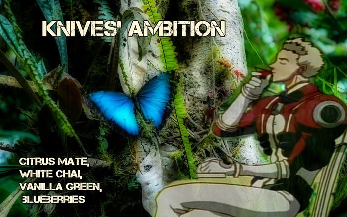 "If you keep saving butterflies the spiders will starve to death! But... wanting to save them both is a contradiction. What would you rather do? Keep deliberating? The butterfly will be eaten in the meantime." Inspired by Million Knives whose "Plant" origins and tense childhood left him with a sour disposition towards humanity. With his blue eyes focused on the extermination of all human beings Citrus Mate, White Chai, Vanilla Green, and Blueberries fits perfectly.