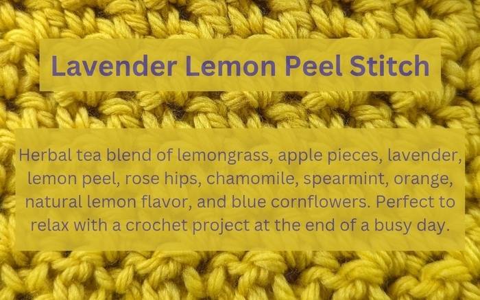 Perfect to relax with a crochet project at the end of a busy day! Combined my favorite aspects of night time herbal teas into one. Herbal tea blend of lemongrass, apple pieces, lavender, lemon peel, rose hips, chamomile, spearmint, orange, natural lemon flavor, and blue cornflowers.
