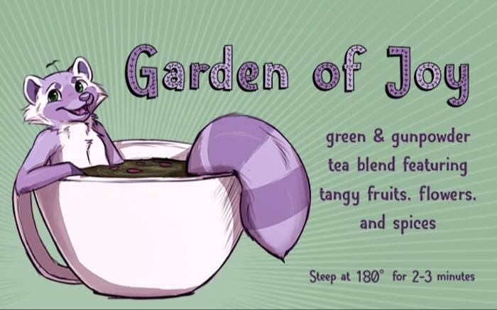Enjoy the fruity and floral flavors of Joy's community garden! Friendship blossoms when delicate marigold and rose flowers meet a bountiful harvest of apple, orange, and apricot. Warm, zesty notes of cinnamon and ginger invigorate for an exciting day at the con. Gunpowder pearls offer a playful touch of raccoon-ish whimsy. Label art by Muttstera