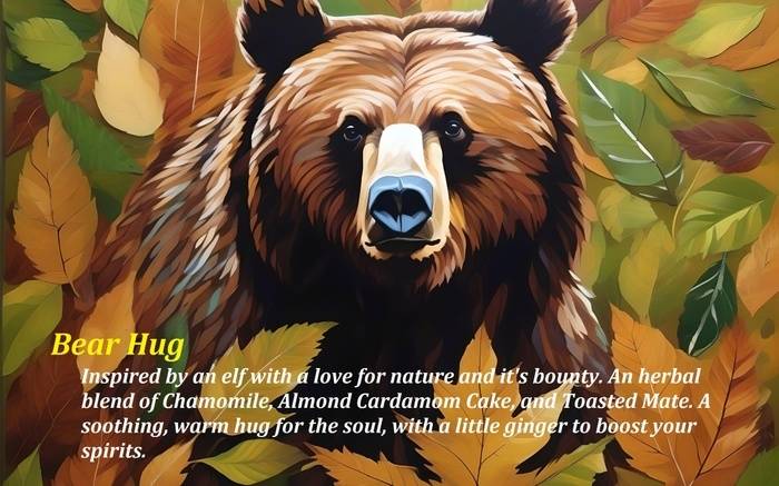 Inspired by an elf with a love for nature and its bounty. An herbal blend of Chamomile, Almond Cardamom Cake, and Toasted Mate. A soothing, warm hug for the soul, with a little ginger to boost your spirits. FULL TASTING NOTES: Smells like gingersnap cookies and molasses. The taste is mellow and warm, if you like chai and want a toned down version this is a good choice. I think this is great choice for an after dinner tea, or to pair with a slice of cake. I also had a sore throat when tasting this tea, and it did wonders for that. If you are feeling under the weather this might be good tea, especially if you don't want the usually lemon ginger combo