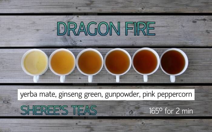 Experience a revitalizing burst of energy with Dragon Fire. The crisp, grassy notes of green tea meet the smoky essence of gunpowder. Infused with the kick of yerba mate and the spice of ginger, each sip offers vitality and zest. Pink peppercorns add a subtle, piquant twist. This tea awakens the senses and rejuvenates the spirit.