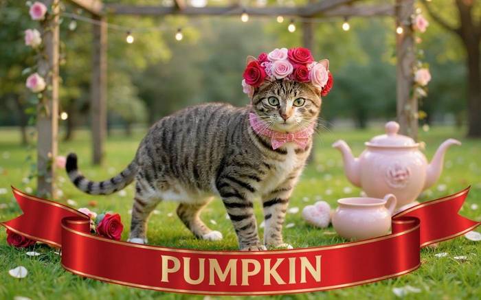 Pumpkin is finding her head wreath annoyingly too large, but she's trying to put on her festive pink and red best. She invites you to join her in having a lovely cup of strawberry chocolate tea under the arbor.