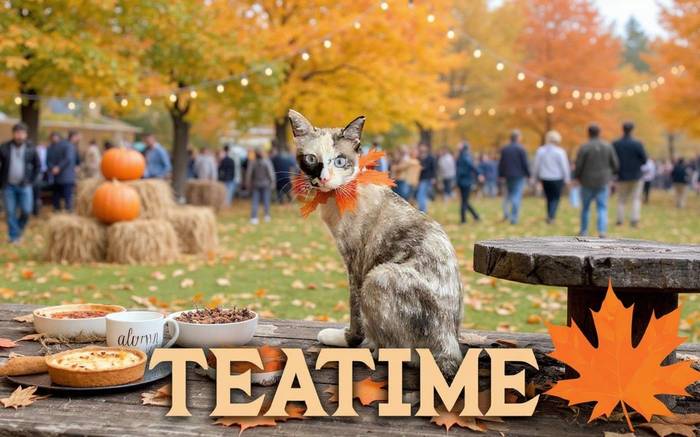 Teatime likes the harvest holiday faire, even though she thinks that there are too many people around. She believes that her cup says "alone", which is how she usually prefers to be. But, she makes an exception for you, because she knows that you love tea as much as she does. She has her harvest tea and snacks ready, and she's waiting for you to join her on this beautiful day.