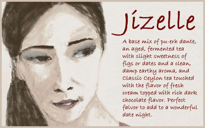 Jizelle is a dark-eyed beautiful girl with Asian features and European spirit. She loves creamy pu erh and appreciates aphrodisiacs, that's why you can taste some chocolate in it.